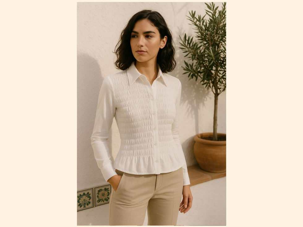 Camisa blanca de manga larga con detalle de fruncido tipo nido de abeja en la parte frontal. Confeccionada en un tejido suave y ligero, cuenta con cuello clásico y cierre de botones. Una prenda versátil, ideal para looks elegantes o casuales.